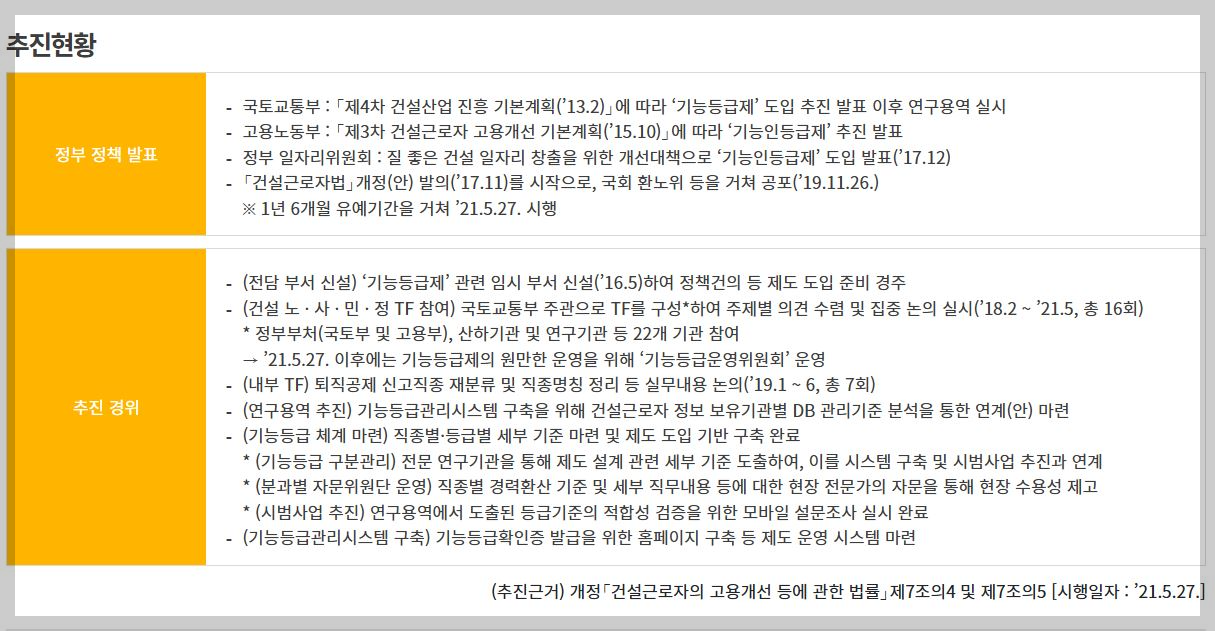 또한 각계에서 , 건설근로자 기능 등급제를 전면 도입하자는 주장이 목소리를 얻는 만큼 건설 노동자라면