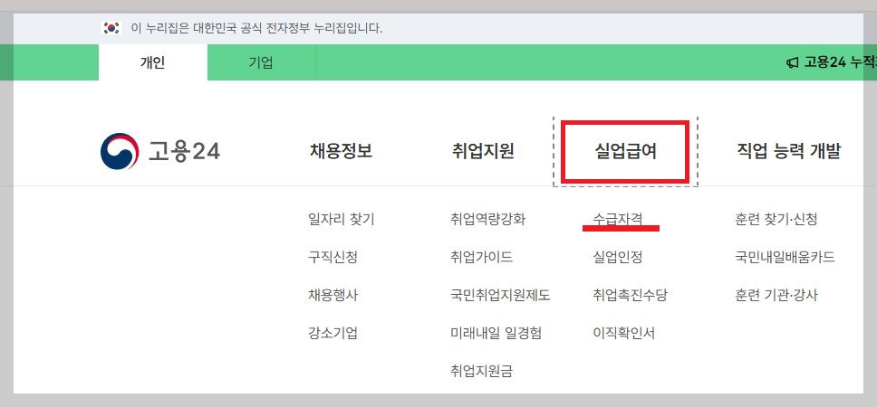 실업급여 클릭 > 수급자격 클릭 >