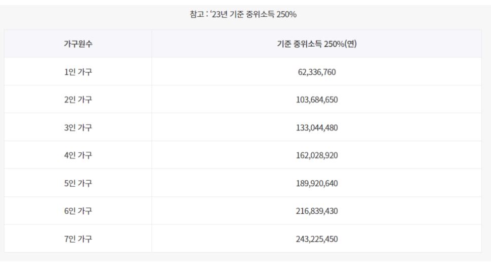 가구원 수에 따른 기준 중위소득 250% 이하에 해당하는 자